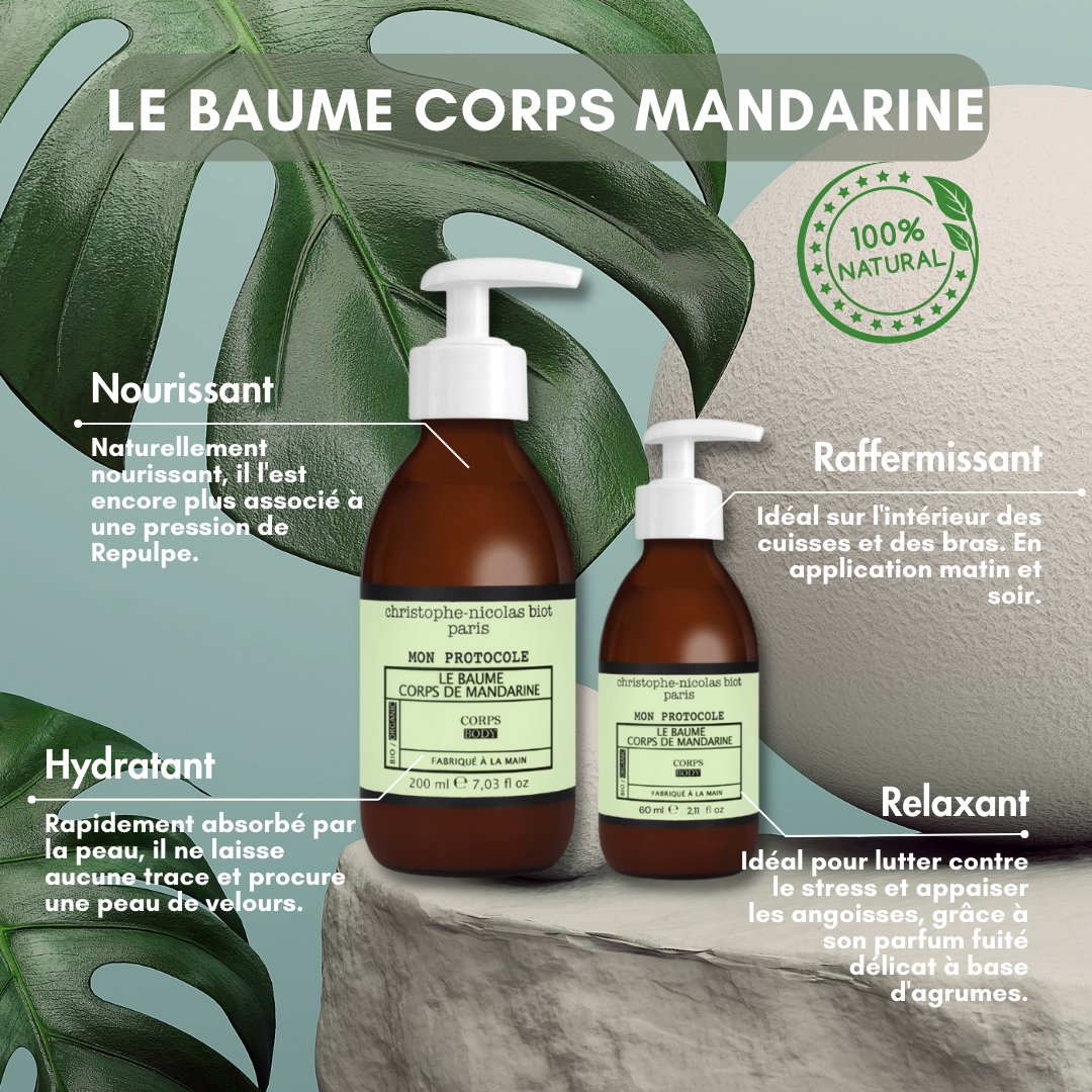 Matin et soir, appliquer et masser l’ensemble du corps. Le Baume Corps de Mandarine peut être associé avec une pression de Repulpe pour un effet plus nourrissant.