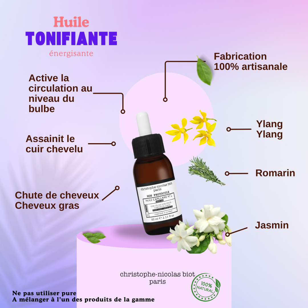 L’Huile Capillaire n°1 de la gamme Mon Protocole assainie le cuir chevelu et active la circulation au niveau du bulbe. Elle est utilisée en mélangeant quelques gouttes à tous les autres produits de la ligne Mon Protocole.
