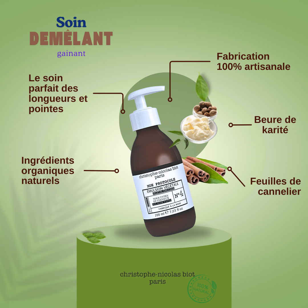 L’Émulsion Végétale n°4 est un produit incroyable qui peut s’utiliser de plusieurs façons : en soin hydratant capillaire, en soin démêlant mais aussi en crème coiffante et comme produit hydratant non gras pour le corps.